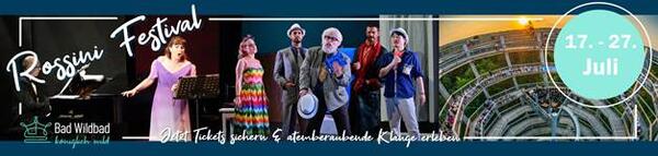 "Seit über dreißig Jahren macht ROSSINI Ungewöhnliches. Wir sind ein ungewöhnliches Festival, das auf neugierige und qualitätsbewusste Besucher aus aller Welt zählt. Ungewöhnlich für ein international renommiertes Opernfestival ist schon der Ort: Im wildromantischen Kurpark inmitten des Nordschwarzwalds würde man zunächst große Oper nicht erwarten. Doch mit dem bezaubernden Königlichen Kurtheater im Stile eines Schweizer Chalets mit neobarocken Elementen und mit der nüchternen Eleganz der neusachlichen Trinkhalle stehen gleich zwei geeignete Spielstätten zur Verfügung, zu denen sich noch einige andere gesellen. Freuen Sie sich auf ein abwechslungsreiches Programm."